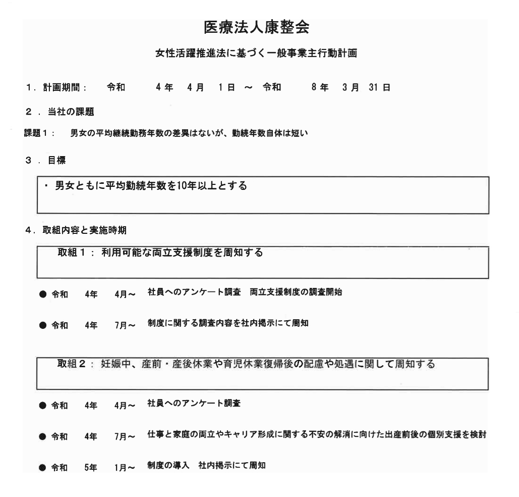 医療法人 康整会は 次世代育成支援対策推進法に基づき「一般事業主行動計画」を公表いたします